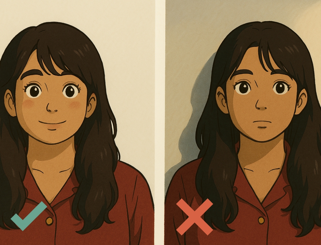 La iluminación debe ser uniforme, sin sombras en el rostro ni detrás.